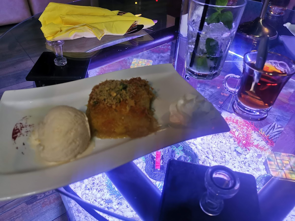 One of the highlights of Agha Lounge is its diverse menu, which includes a variety of mouthwatering dishes that cater to all tastes. If you’re in the mood for something sweet, try their Baklava or Banoffee Waffle, both of which are fan favorites. For a savory experience, Lamb Chops and Chicken Kebab are absolute must-tries. The Veggie Platter is perfect for vegetarians, and for those who enjoy something refreshing, their Strawberry Mojito or Blueberries Mint with Ice are ideal choices. Agha Lounge also offers a selection of Shisha, including Apple Shisha and Shisha Mint, ideal for relaxing after a delicious meal.